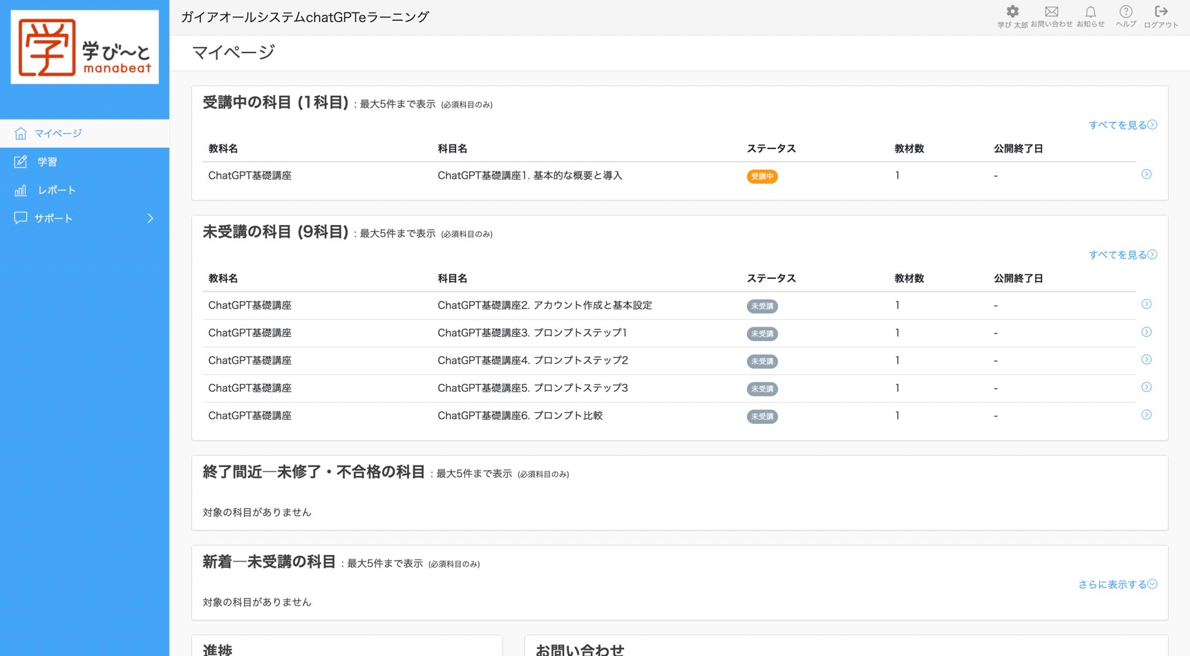 ChatGPT導入研修教材にログイン後、シンプルな画面で学習を進められます。